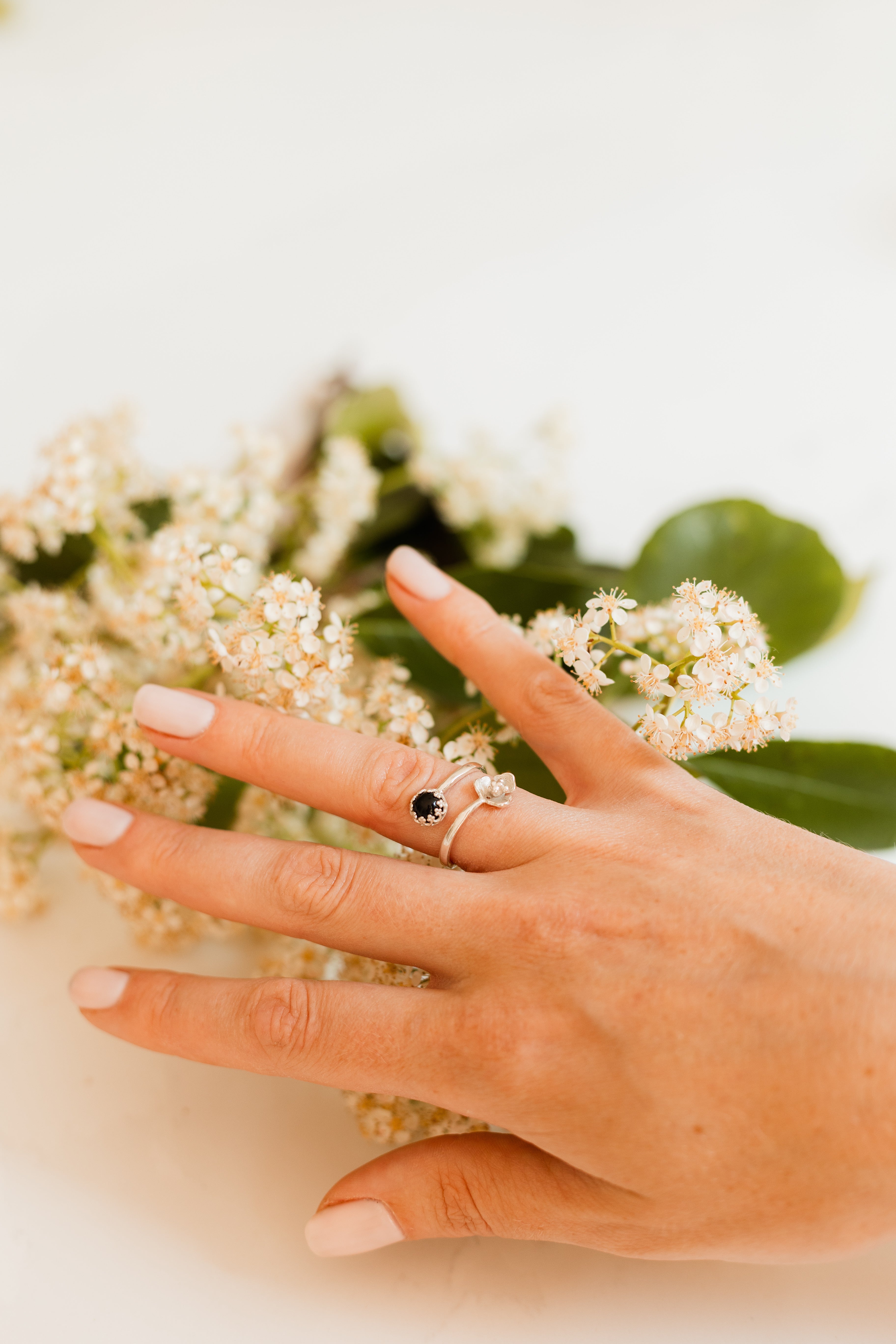 Sterling silver wrap around flower ring; onyx sphere with delicate flower.